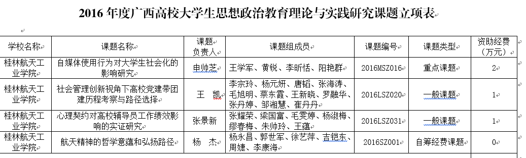 近日,收到《关于下达2016年度广西高校大学生思想政治教育理论与实践立项研究课题的通知》,我校有四个课题获得立项,其中重点项目一项,一般项目两项,自筹项目一项。