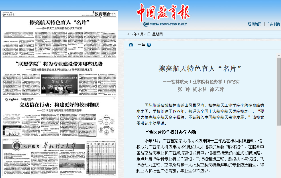 今年5月,广西首家无人机技术应用院士工作站在桂林航院启动,该校成为广西无人机应用技术创新型人才培养的重要“孵化器”。在服务中国航空航天事业和广西经济建设发展中,该校坚持走好内涵式发展道路,重点开展“学科专业特区”建设。飞行器制造工程、测控技术与仪器、飞行器动力工程、空中乘务等一大批航空航天特色鲜明的专业应运而生,得到业内和社会广泛肯定,毕业生供不应求。