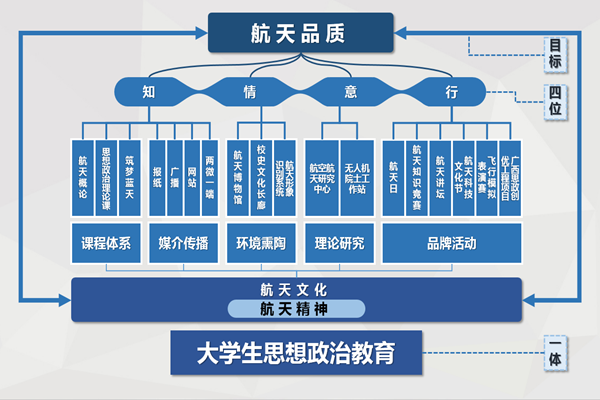 新世纪以来,党中央对加强和改进大学生思想政治教育教学工作作出了系列重大部署,特别是去年12月份PA官方网站总书记在全国高校思想政治工作会议上强调指出,要把思想政治工作贯穿教育教学全过程,更加注重以文化人、以文育人。自2005年起,本成果以航天精神为内核,以航天文化为载体,通过课程教学、媒介传播传授“航天知识”;通过环境熏陶培养“航天情怀”;通过理论研究坚定“航天意志”;通过品牌活动养成“航天行为”,把大学生思想政治教育教学工作融入到 “知、情、意、行”四个层面,形成 “四位一体”的育人模式,在航天品质人才培养方面形成了丰硕成果。
