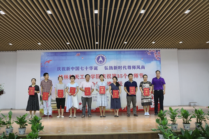 易忠代表学校宣读2019年“三全育人”先进个人表彰文件、2019年师德师风建设专题征文比赛表彰文件,校领导分别为获奖教师和集体颁奖。