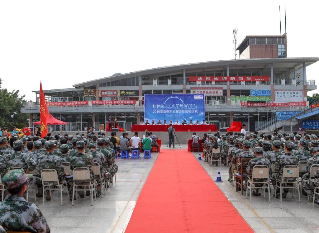 9月20日, 我校2019赛季新车发布会暨出征仪式正式举行,由在校师生自主设计、制造和调试的方程式赛车V-05号油车、航V-E03号电车崭新亮相。学校校长易忠、桂林市桂路通集团董事长程东、速才驾校总经理陈宁、学工处、校团委、教务处及各学院主要负责人出席发布会。