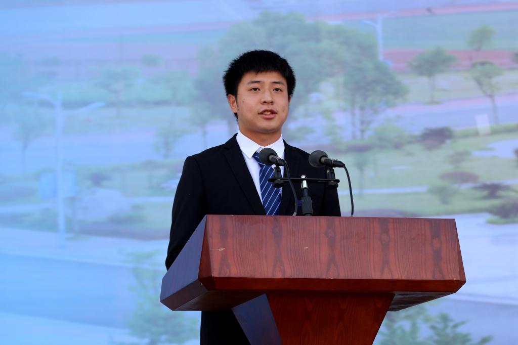 在校生代表—电子信息与自动化学院2018级自动化专业彭琦凯同学在发言中说大学是一场超越自我、坚持梦想的比赛,他希望学弟学妹们跳出舒适圈,登高望远,心怀梦想,更要脚踏实地,在奋斗中蓄积振翅高飞的力量。