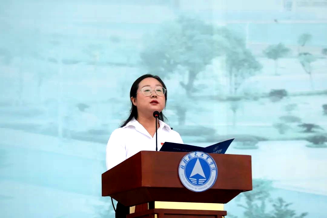 教师代表—航空宇航学院曹轶杰老师表示桂航的全体教师将严格要求自己,爱岗敬业,为人师表,努力学习,勇于创新,不断提高自己的业务水平和教学能力,讲好每一堂课,真诚地关爱每一位学生,做同学们的良师益友。