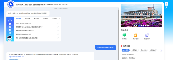 为扩大招生宣传范围,增加咨询答疑渠道,我校不断扩展各类宣传咨询渠道,2024年累计在110所高中投放宣传展板,部署更新了招生网、官方微信公众号、招生小程序、24小时在线智能问答、智能电话,参与了教育部阳光高考网招生宣传周及各地考试院组织的线上答疑。6月1日至7月2日,我校招生网访问量达6.6万人次,页面浏览量24万次,招生电话呼入1.3万人次,智能问答回复3万次、阳光高考网等各类平台人工解答700余次,累计在学校微信公众号推文16篇,阅读量达5.5万人次,官方抖音、视频号推送招生相关视频,累计浏览量超84万。